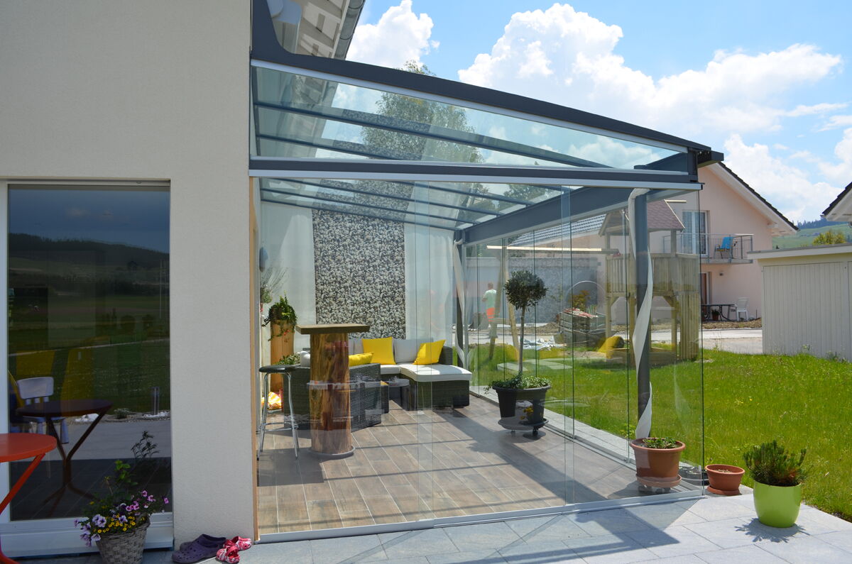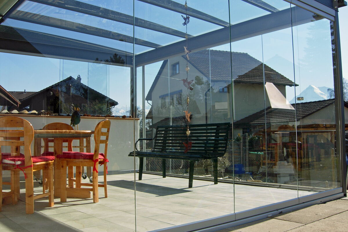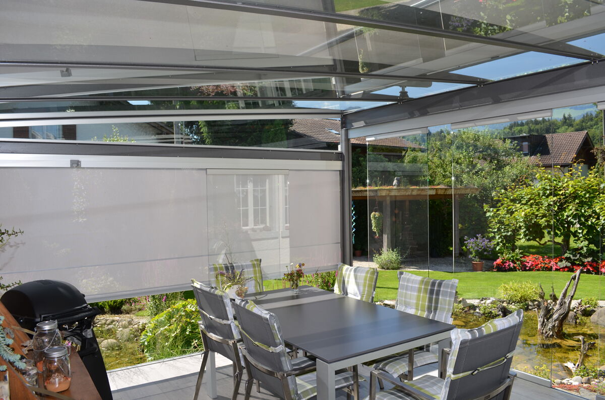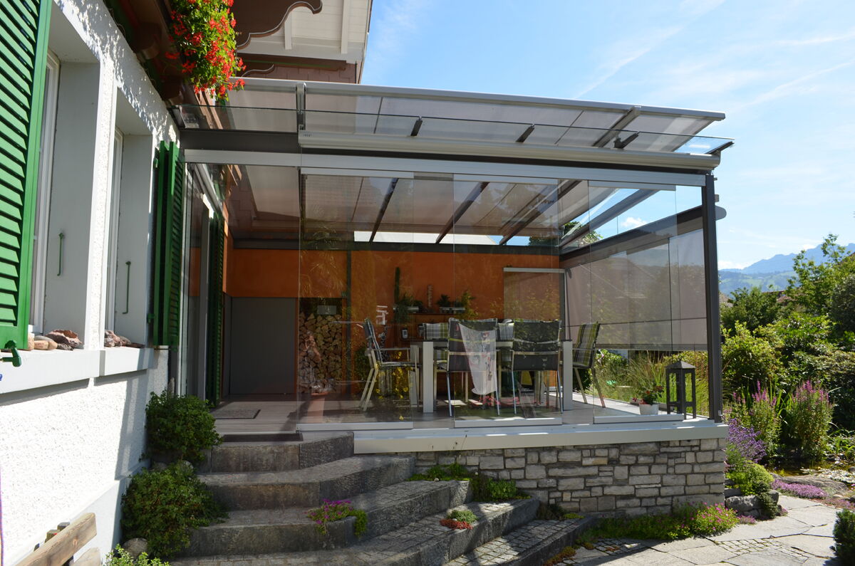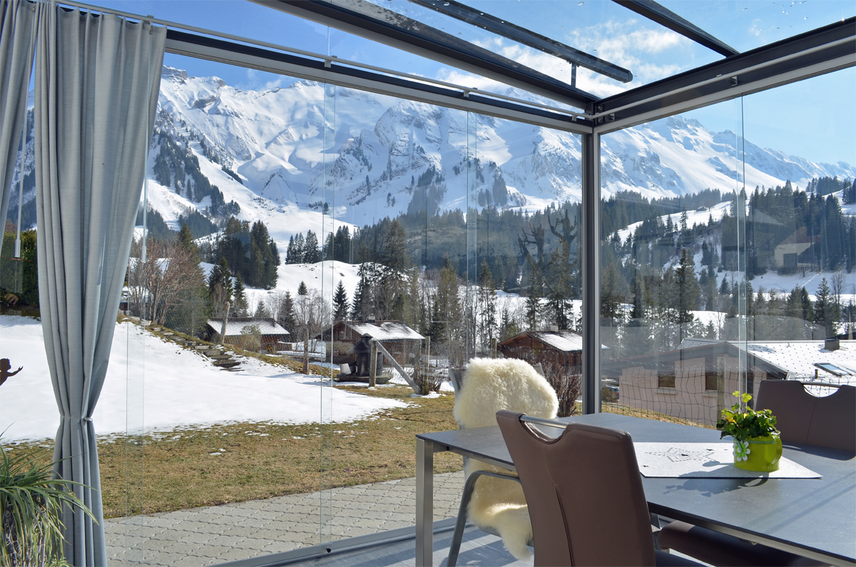 Die vertikalen Verglasungen werden profillos, in Ganzglasoptik hergestellt. Dies ermöglicht einen ungestörten Blick nach aussen und lässt Sie die Aussicht ohne Einschränkung geniessen.