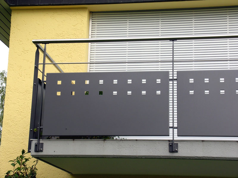 Geschlossene Geländer: Geschlossene oder halbtransparente Geländer bieten zusätzlich Diskretion und Sichtschutz. Dank unseren Möglichkeiten in der Blechverarbeitung stehen Ihnen viele Gestaltungsmöglichen offen.
