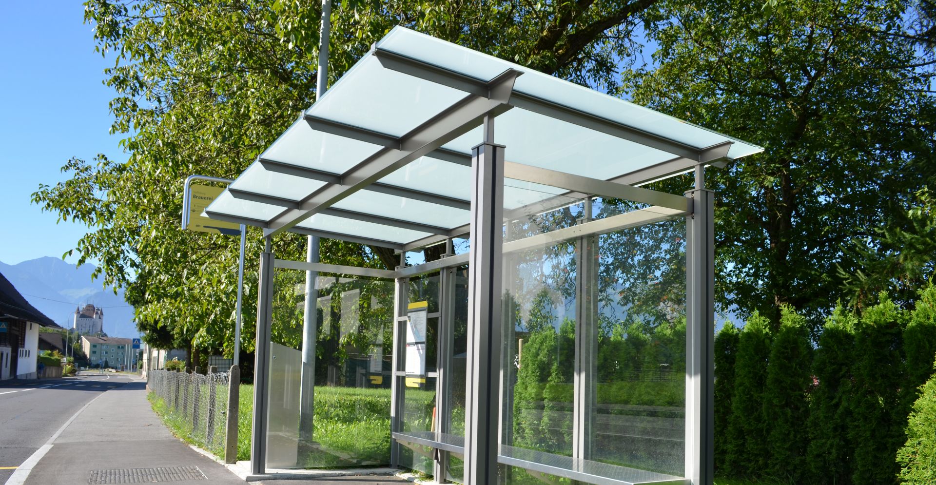 Unterstände im eigenentwicklten System PESO© werden im öffentlichen Bereich eingesetzt, um den wartenden Busfahrgästen Zuflucht und Schutz vor Wind und Wetter zu bieten.
