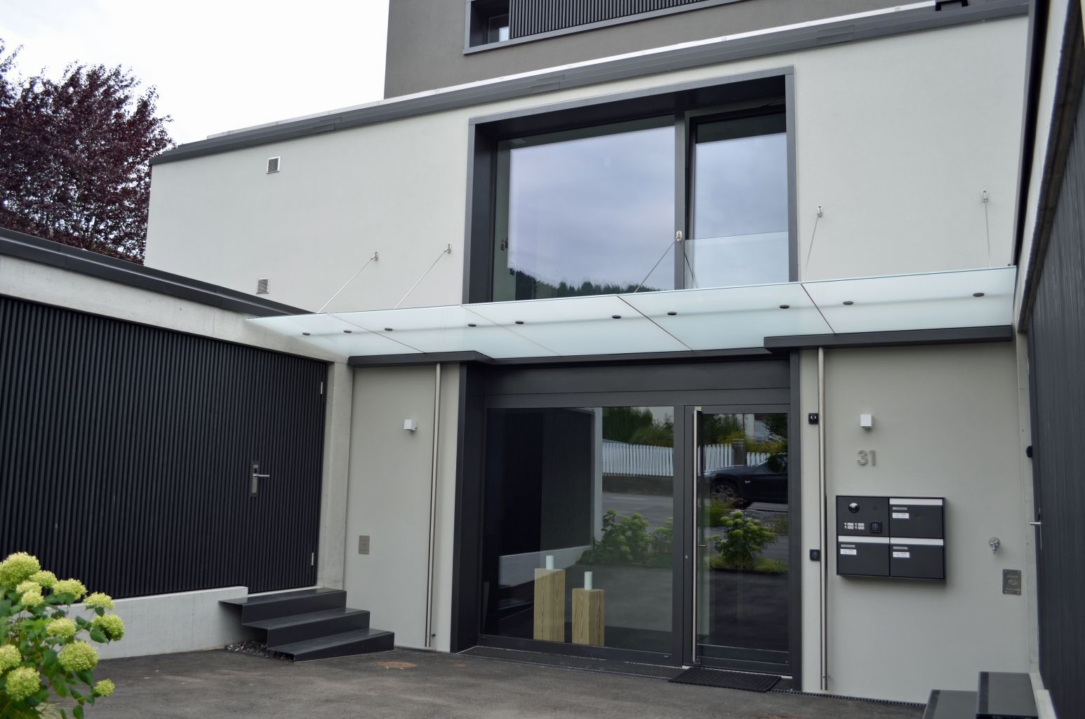 - Glasvordächer in Ganzglas Ausführungmit Zugstangensystem an Fassade befestigt