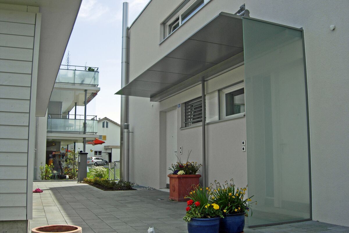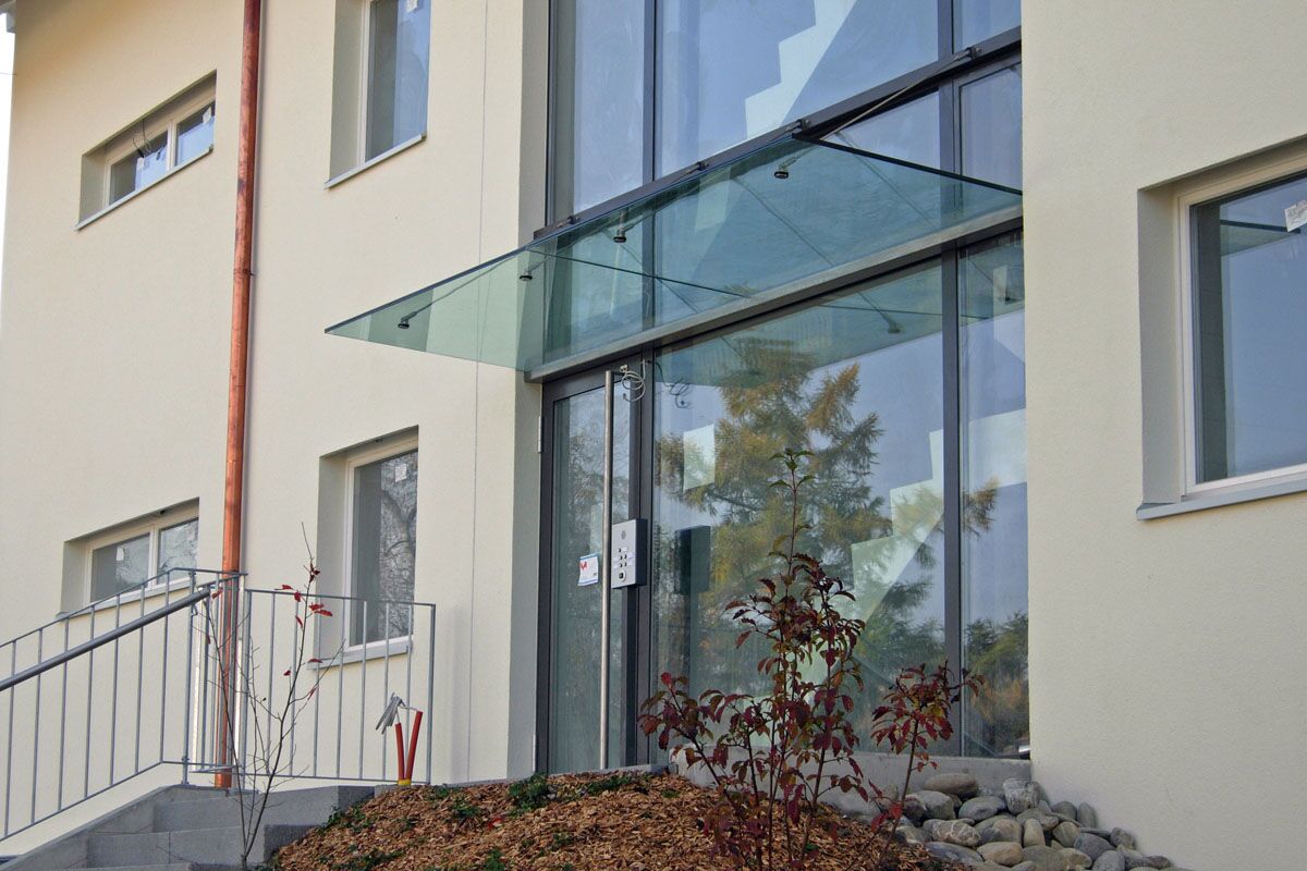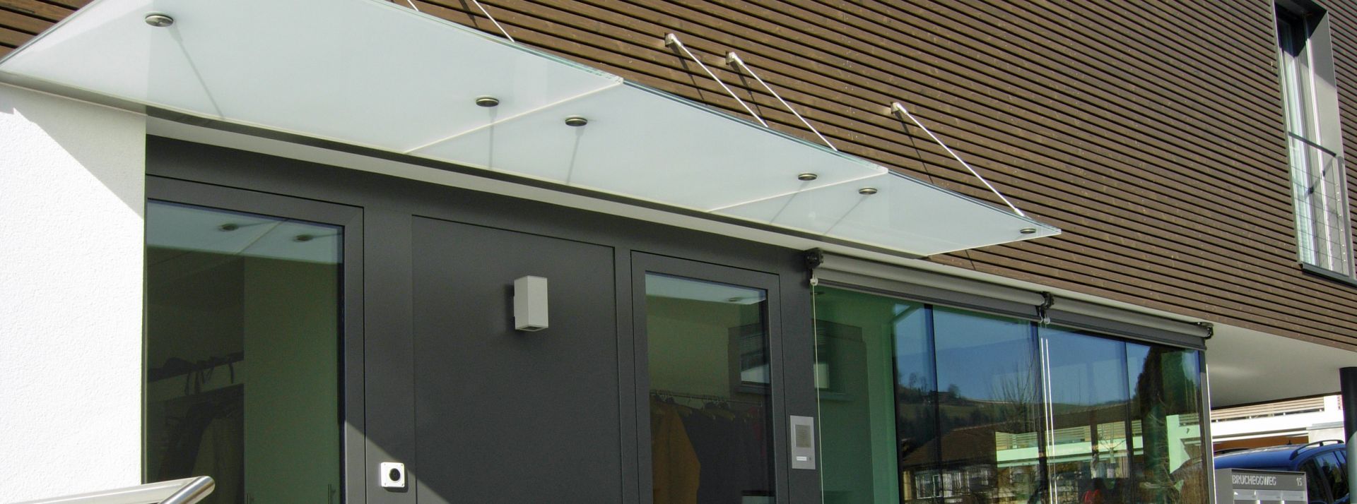 - Glasvordächer an Wand befestigt und auf Stützen aufgelagert