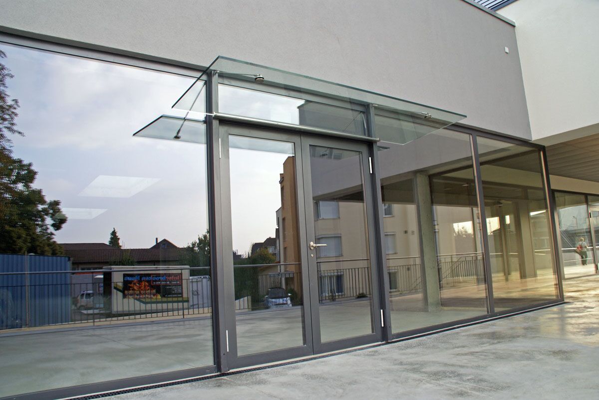 - Glasvordächer mit Glastragprofilen in T-Stahl mit Zugstangensystem an Fassade befestigt