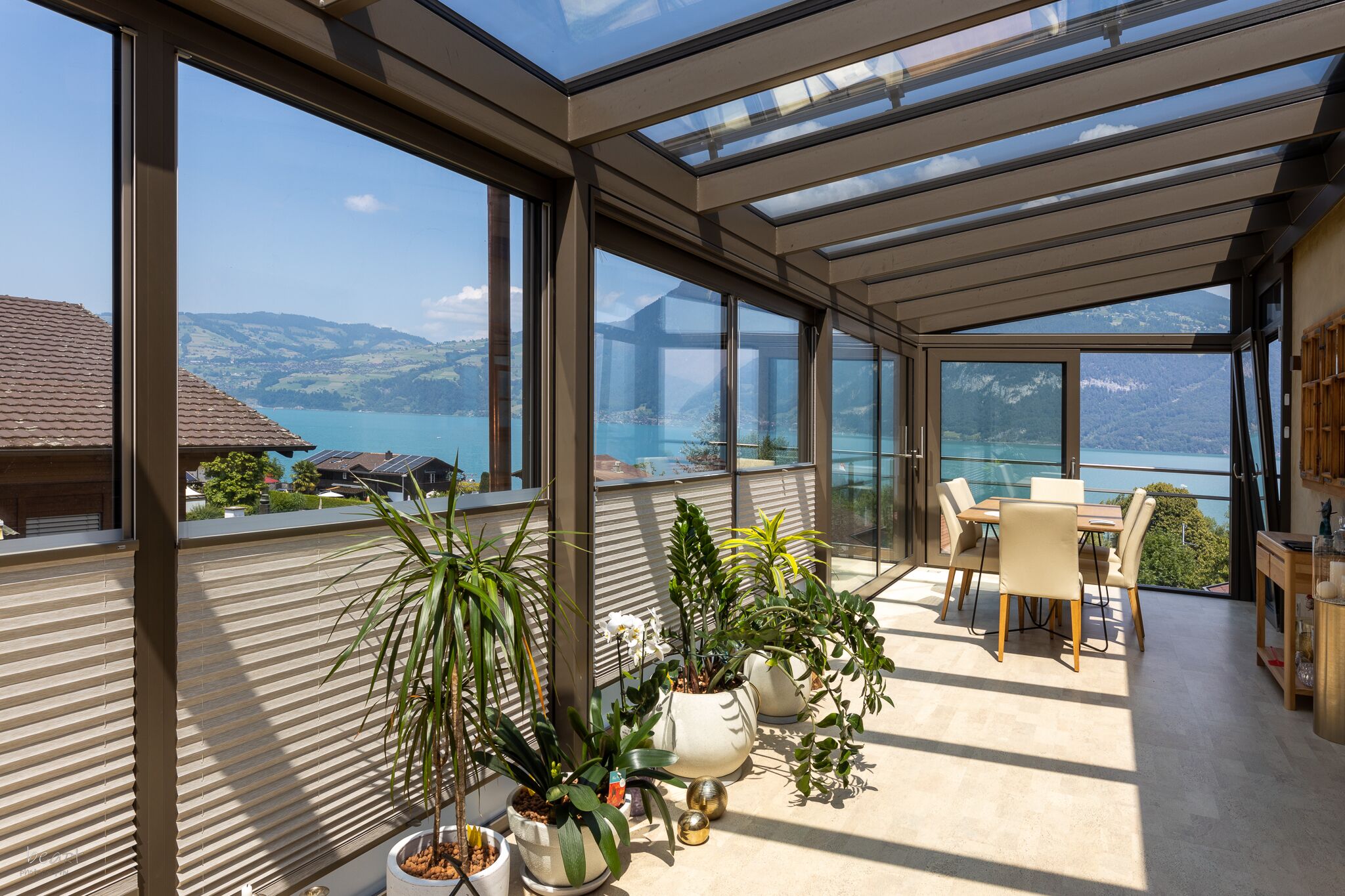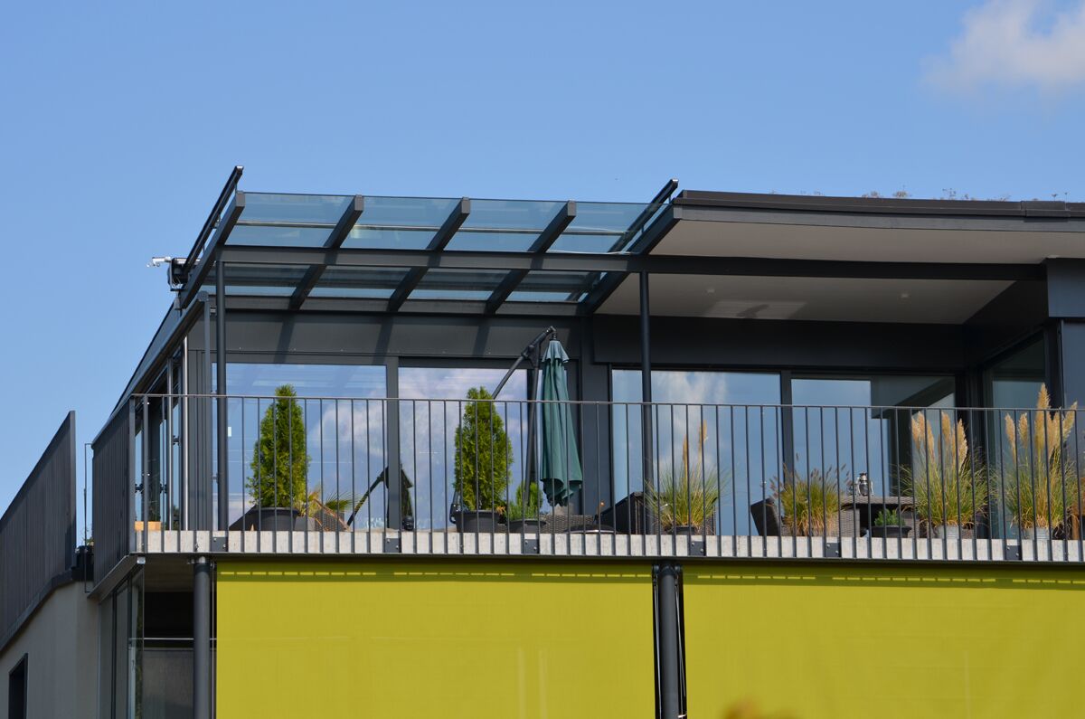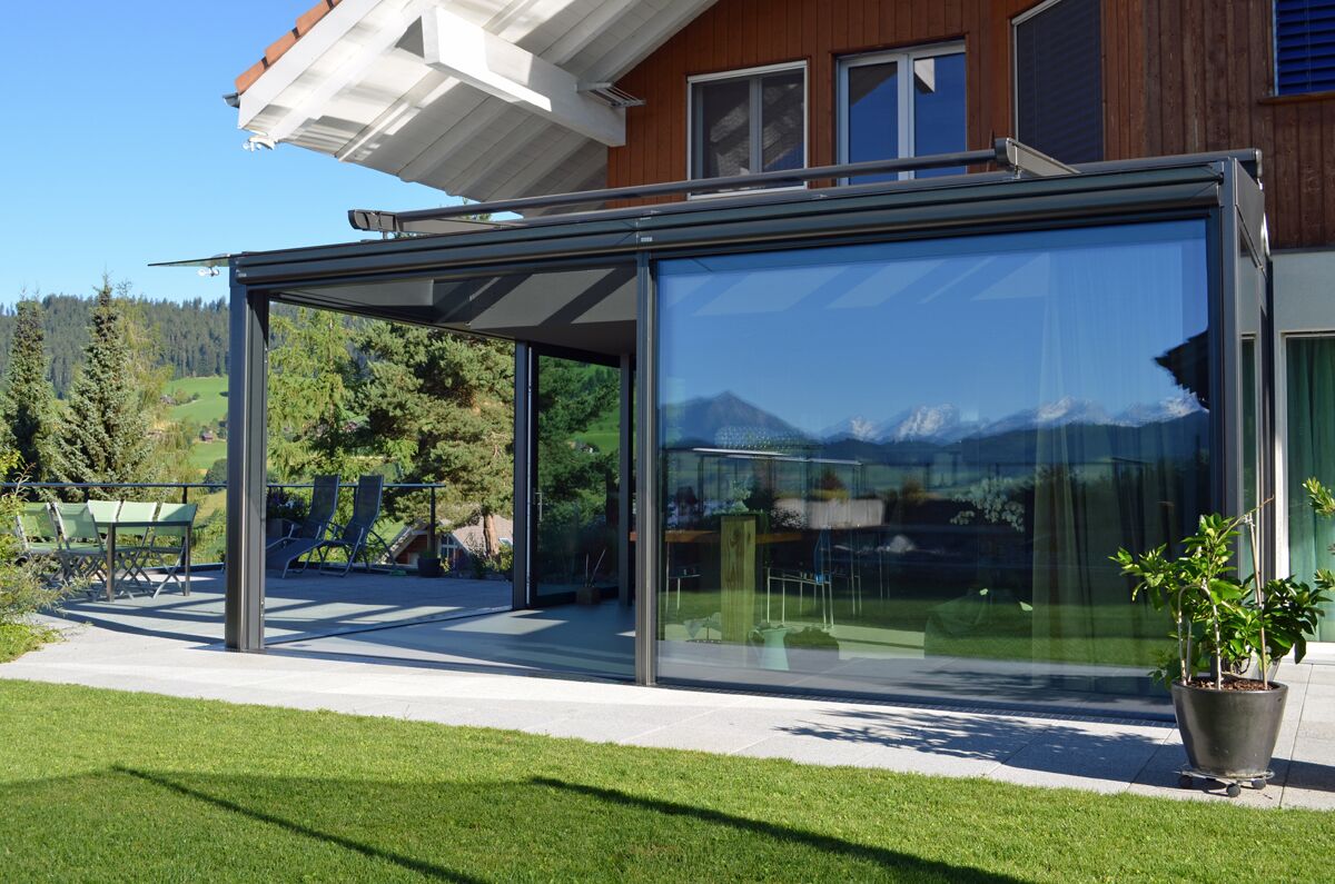 - Eingesetzt werden Dachbeschattungen und Vertikalbeschattungen der Schweizer Marke Stobag